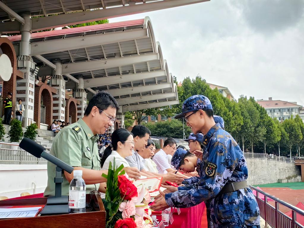 比学赶超练精兵,强我理工展风采。党委常委、组织部部长郭建锋现场为承训部队赠送锦旗,表达了学校对承训部队的衷心感谢。团委书记苏伟、临沂校区团委副书记王彤宣读2023级新生军训工作先进集体和个人表彰决定。学校领导依次为受表彰的先进集体和先进个人颁奖。