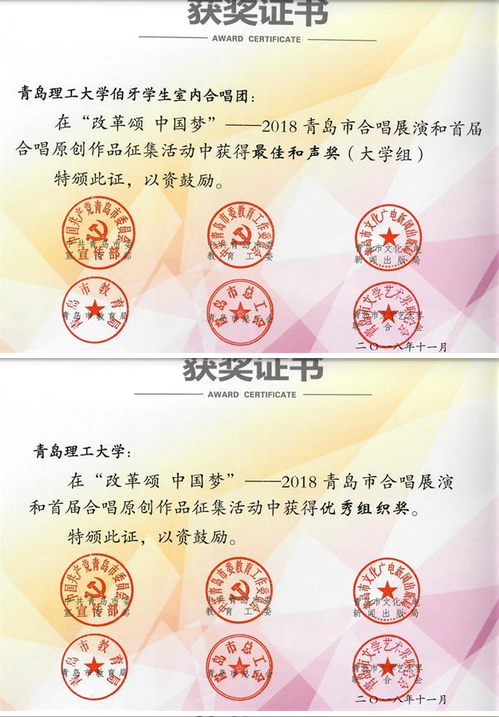 12月25日,“改革颂,中国梦”2018青岛市合唱展演成绩揭晓,77779193永利集团伯牙学生室内合唱团获得最佳和声奖,我校获得优秀组织奖,艺术与设计学院张萌老师获得优秀组织工作者奖。