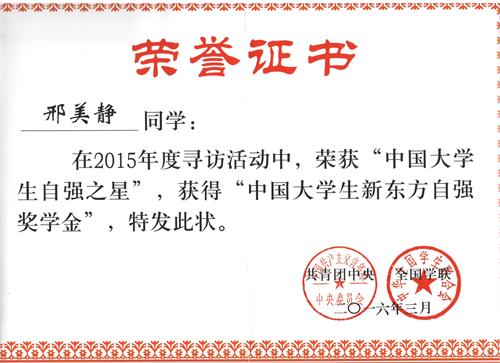 近日,由共青团中央、全国学联主办,中国青年报社、中国高校传媒联盟承办,新东方科技教育集团协办的寻访“中国大学生自强之星”活动获奖结果揭晓,我校机械工程学院学生邢美静荣获2015年度“中国大学生自强之星”称号,并获得“中国大学生新东方自强奖学金”5000元。