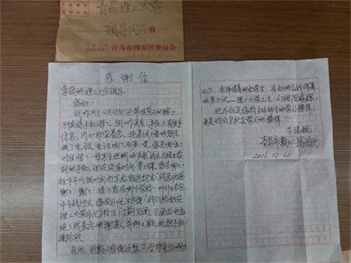 12月28日,土木学院团总支公室收到了鞍山路居民送来的一封感谢信,感谢土木167班陈晓辉同学的拾金不昧。