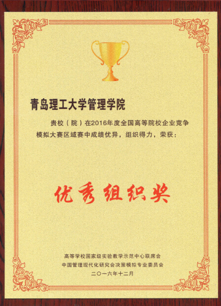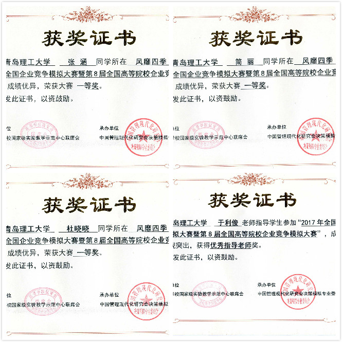 2017年4月28日,由高等学校国家级实验教学示范中心联席会和中国管理现代化研究会决策模拟专业委员会主办的全国企业竞争模拟大赛总决赛在烟台大学落下帷幕,我校管理学院张涵、简丽和杜晓晓同学组成的77779193永利集团“风靡四季”团队在指导老师于利俊的带领下喜获全国一等奖,我校荣获“优秀组织奖”,于利俊被评为“优秀指导老师”。