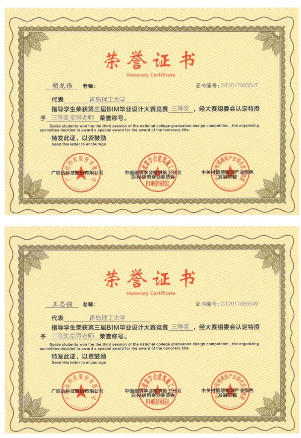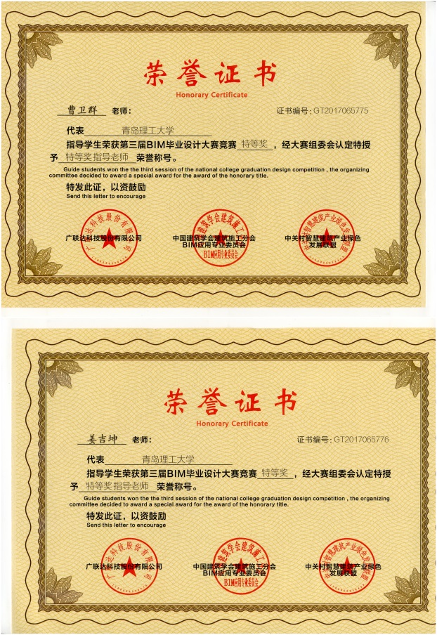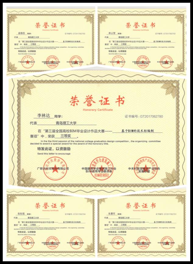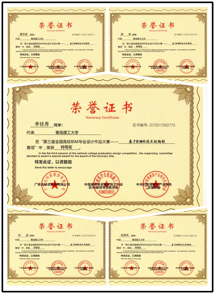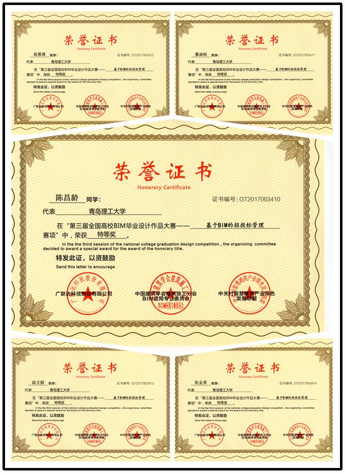 管理学院领导高度重视,精心组织,依托国际工程项目管理、工程造价、工程管理省级品牌、特色专业,从师资、资金、技术等方面提供全方位服务与支持。从2016年10月至2017年6月历时近9个月,参赛同学和指导老师付出了巨大努力。在专业教师的精心指导、学生的热情参与、团队成员团结协作和精心准备下,管理学院国际工程项目管理专业两支队伍“砼一个梦想”和“筑梦青理”(两支队伍指导教师均为姜吉坤、曹卫群)在提交的作品和现场答辩环节获得了评委组的高度认可,分别荣获国家特等奖,并获得广联达软件应用技能认证证书。
