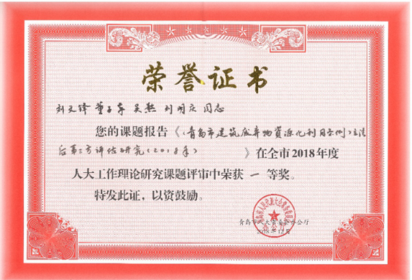 今年,根据青岛市人大工作理论研究立项课题需求和建筑与法学跨学科课题研究特色,土木工程学院组建了师生共同参与的大学生创新团队,本科学生董子章、吴熬、刘明庆、宋岩超、葛昌伟、葛景跃为团队成员,团队持之以恒,齐心协力,一遍一遍地整合、修改、凝练作品,常常在工作室研究到深夜,完成课题成果《青岛市建筑废弃物资源化利用条例立法后第三方评估研究(2018)》,得到专家一致好评,取得佳绩。(撰稿:杨延生 审核:裴根 责任编辑:李昕 万国臻)