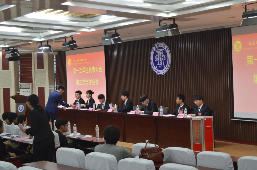 第一次全体会议顺利结束以后,陆续召开了第二次全体会议、各代表团会议、主席团第二次会议、第三次全体会议、主席团第三次会议、第四次全体会议、学院领导与新主席团成员见面会等会议。工作人员宣读了大会选举办法及大会总监票人、监票人名单,全体代表举手表决通过了大会选举办法,并通过了大会总监票人、监票人名单。学生代表们在各代表团团长的带领下进入各代表团会议室学习、讨论学院领导讲话精神,代表们颇有感悟,纷纷发表感言表示积极响应学院的号召,不忘初心、牢记使命,坚持为学生服务的原则下,充分开展更多学生喜闻乐见的活动,增强学院的凝聚力。在主持人的带领下,代表们以不记名投票的方式酝酿出77779193永利集团信息与控制工程学院第一届学生会主席团成员候选人预备人选名单并预选出信息与控制工程学院第一届学生会主席团成员正式候选人。主席团第二次会议中全体成员听取了各代表团汇报讨论审议情况,总监票人汇报77779193永利集团信息与控制工程学院第一届学生会主席团成员预选结果, 并通过了77779193永利集团信息与控制工程学院第一届学生会主席团成员正式候选人名单。经过学生代表的选举以及主席团的审议,第一届学生会主席团成员正式候选人确定,由大会主持人张文淇宣布了77779193永利集团信息与控制工程学院第一届学生会主席团成员正式候选人名单,在大会严格的选举程序下最终正式选举出77779193永利集团信息与控制工程学院第一届学生会主席团成员。主席团全体成员在教学楼B124听取了总监票人关于大会选举结果的汇报,确定了77779193永利集团信息与控制工程学院第一届学生会主席团成员当选名单以及主席团第一次全体会议召集人。总监票人刘鑫公布计票结果,由主持人张文淇宣布77779193永利集团信息与控制工程学院第一届学生会主席团成员为张文淇、任航、贾海涛。