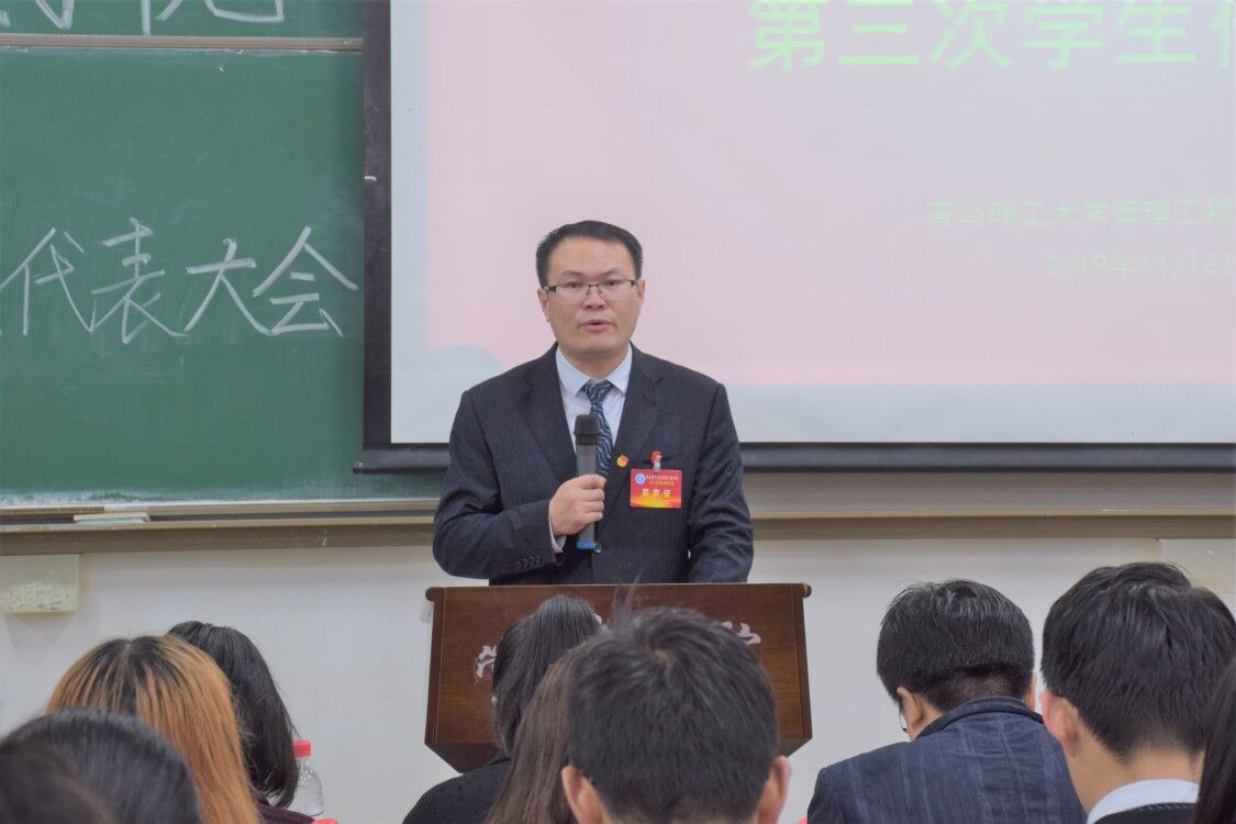 11月23日,管理工程学院第三次学生代表大会在主教学楼B-130胜利召开。学院党总支副书记于利俊、分团委书记、学工办主任陈永亮、全体辅导员、校学生会主席钟源、兄弟学院学生会代表和学院70名学生代表参加本次大会,会议由陈永亮主持。