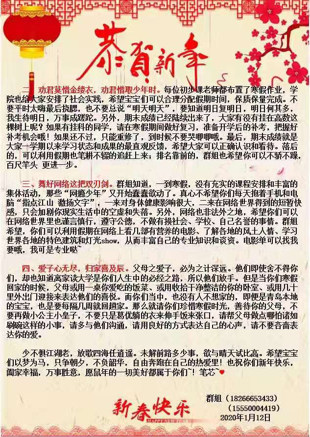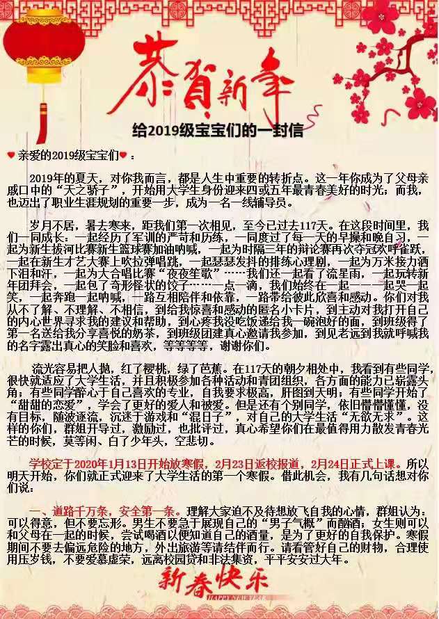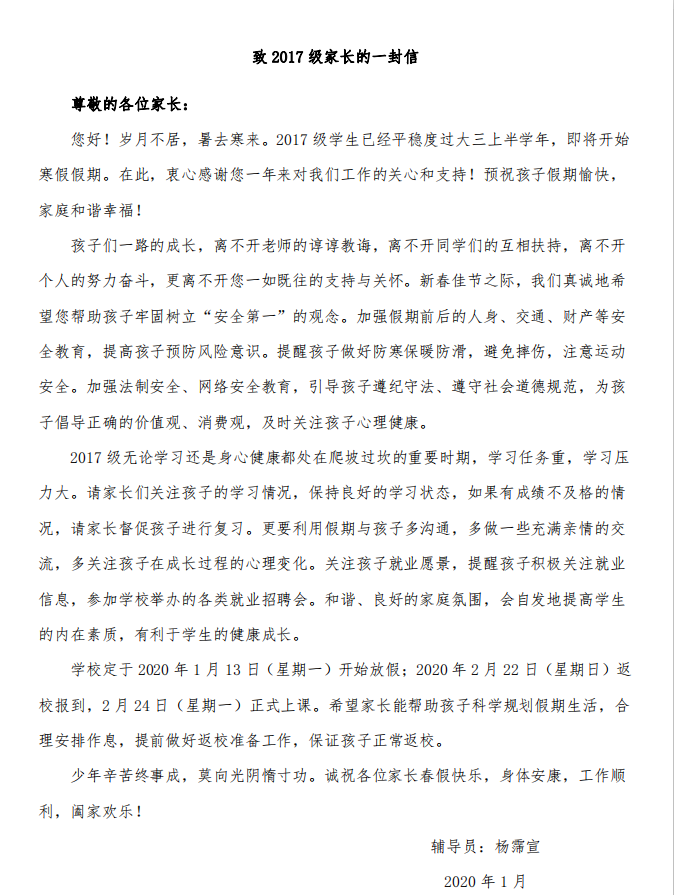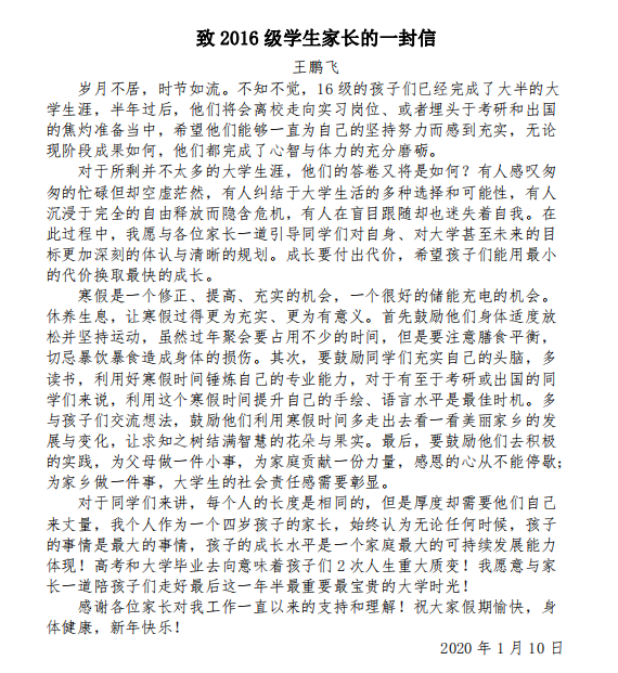 同向同行,跟家长说说心里话。学院学生工作办公室主任、分团委书记、16级辅导员王鹏飞为学生家长写了一封亲笔信。他在信里希望家长能够“多与孩子们交流想法,鼓励他们利用寒假时间多走出去看一看美丽家乡的发展与变化,让求知之树结满智慧的花朵与果实。”“多与孩子们交流想法,鼓励他们利用寒假时间多走出去看一看美丽家乡的发展与变化,让求知之树结满智慧的花朵与果实。”字里行间充满了对即将毕业的同学们的关怀,充满了对家校进一步合作的期盼。