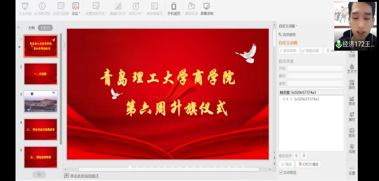 4月27日上午9点,第六周“云升旗”如约和大家见面。本次线上升旗仪式由电商171班黄继敏主持,借助腾讯会议以网络视频的形式展开。商学院全体辅导员和学院1000余名无课学生参加了本次“云升旗”仪式。