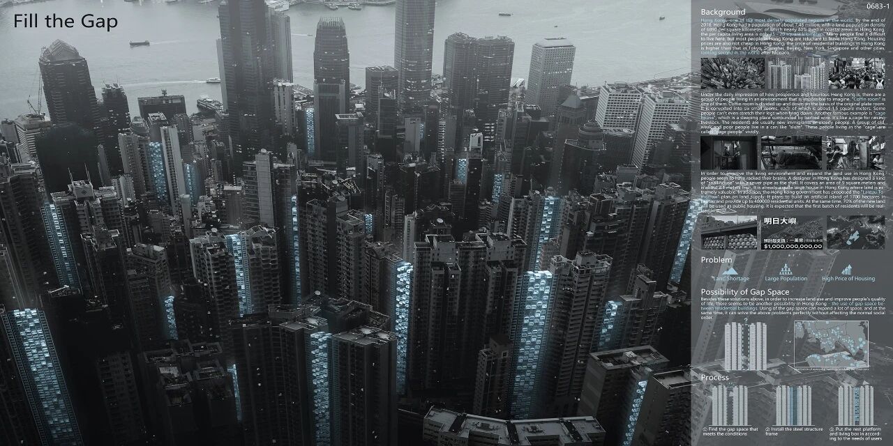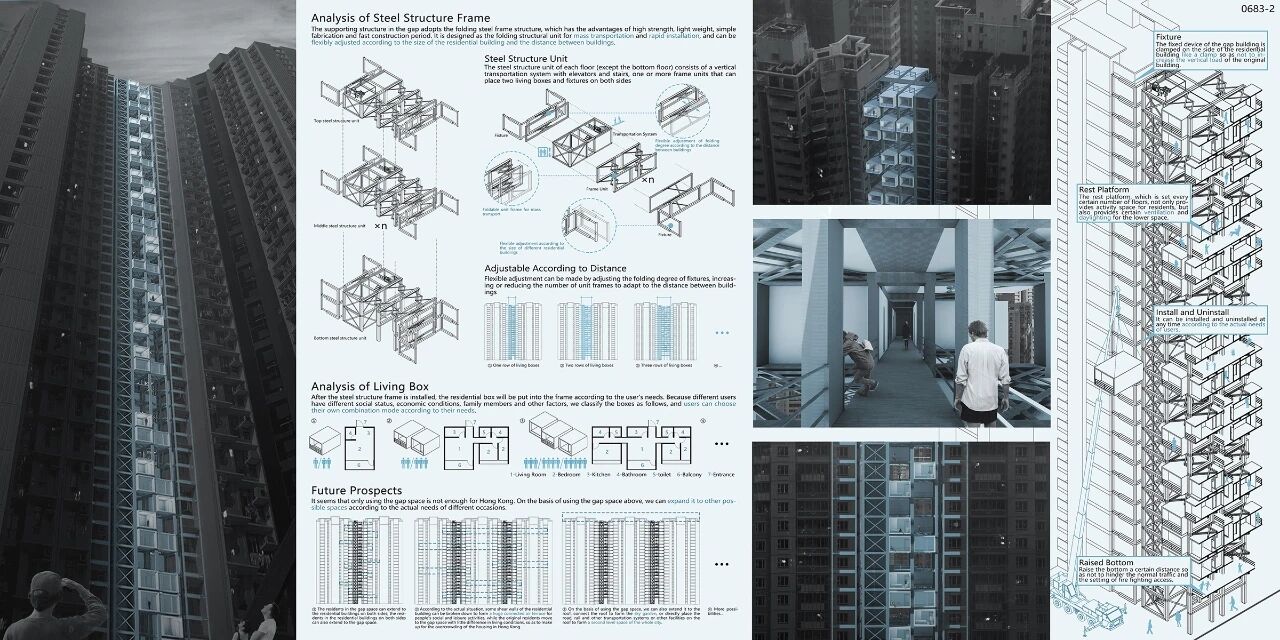 我校获奖作品《缝隙大楼》旨在解决香港城市中人口居住的问题,香港的人均居住面积只有15 - 20平方米,房屋价格也不便宜,因此总有一群人生活在狭窄“棺材房”和“笼屋”中。为了增加土地的用途和改善市民的生活质量,设计者认为香港似乎还有另一种可能,就是利用住宅楼宇之间的间隔空间扩大居住的空间,同时在不影响正常社会秩序的前提下,完美的解决上述问题。缝隙中的支撑结构采用折钢框架结构,并采用一种可折叠的结构单元,可以根据住宅建筑的大小和建筑之间的距离进行灵活的调整。考虑到不同的用户有不同的社会地位、经济条件、家庭成员等因素,设计者还对各种结构单元进行了分类,用户可以根据自己的需要选择自己的组合。