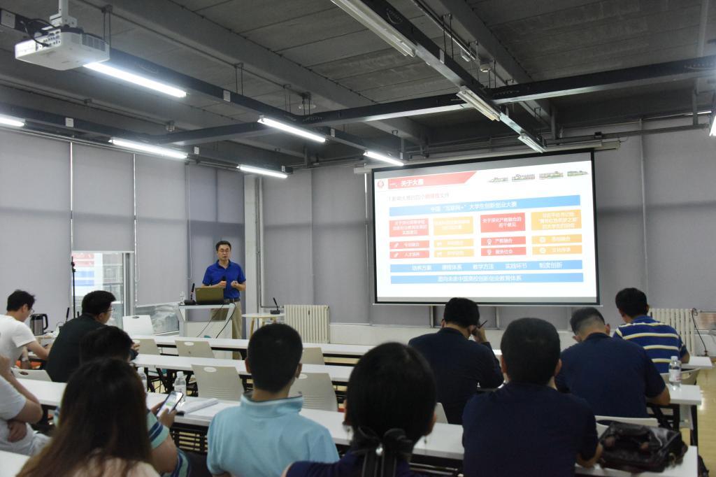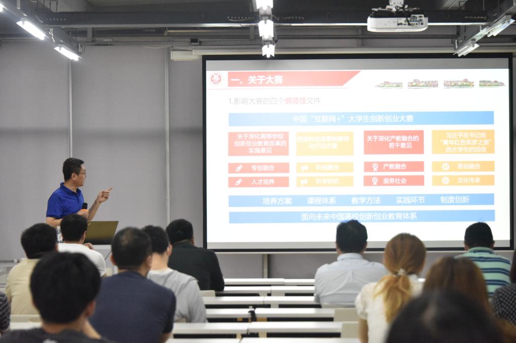 李忠晓从四个方面系统地介绍了创新创业大赛。他首先介绍了大赛的来源和特点,指出应多视角看大赛,看清“互联网+”大赛在中国各类科技创新赛事中所处的位置。随后,李忠晓对第六届大赛主题、大赛的目的和任务、总体安排等做出了详细解读,点出学生参与率高而获奖情况低的问题,指出应做到以赛促学、以赛促教、以赛促创,并在社会上找到立足点,拥有家国情怀的素质教育。同时他表明参赛项目不止限于“互联网+”概念,鼓励各类双创项目参赛。
