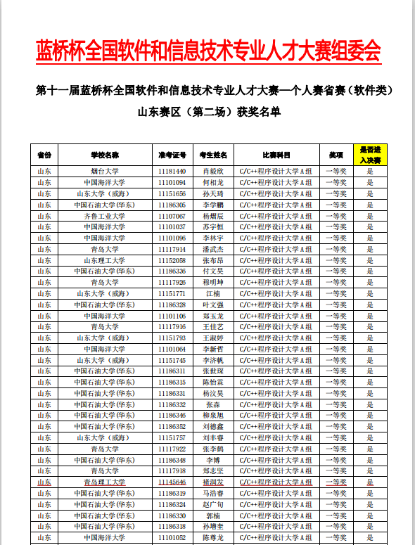 日前,第十一届“蓝桥杯”全国软件与信息技术专业人才大赛省赛成绩公布。我校学子获山东赛区一等奖21人、二等奖62人、三等奖69人。褚润发、孙宏臣获得C/C++程序设计A组一等奖,孙涵睿、孟洋、王子宁、耿家浩、杨金树、杨晓岐、柴多、刘子涵和郑振松获得C/C++程序设计B组一等奖,陈辰、赵文勋、于杏林、侯丽艳、李爱伟和张玉飞获得JAVA软件开发B组一等奖,刘永琨、冯堂虎、张志远和祝正鹏获得python语言程序设计一等奖。获得一等奖的选手将于11月14日参加全国总决赛。