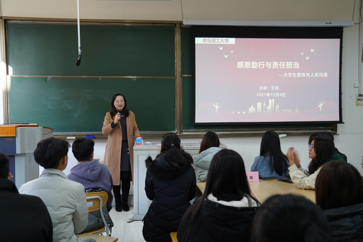 王老师采用互动式、体验式、启发式的高效教学模式,从大学生素养与价值观、大学生关系交往礼仪、大学生职业发展规划、大学生结构性思维与应用、基于性格分析的沟通与协作五个方面进行了讲授。
