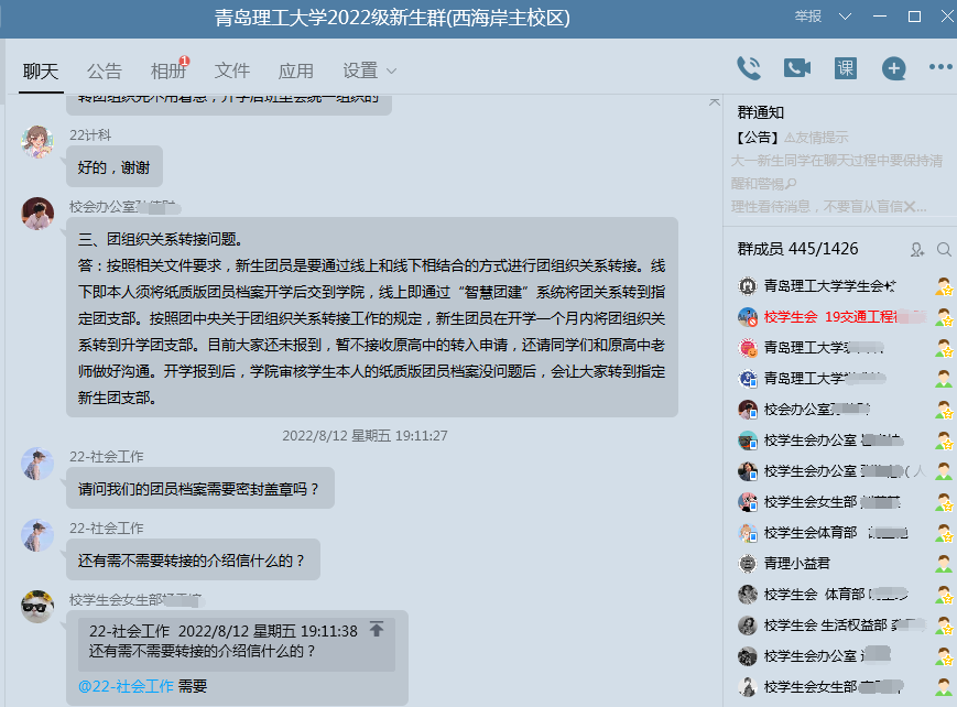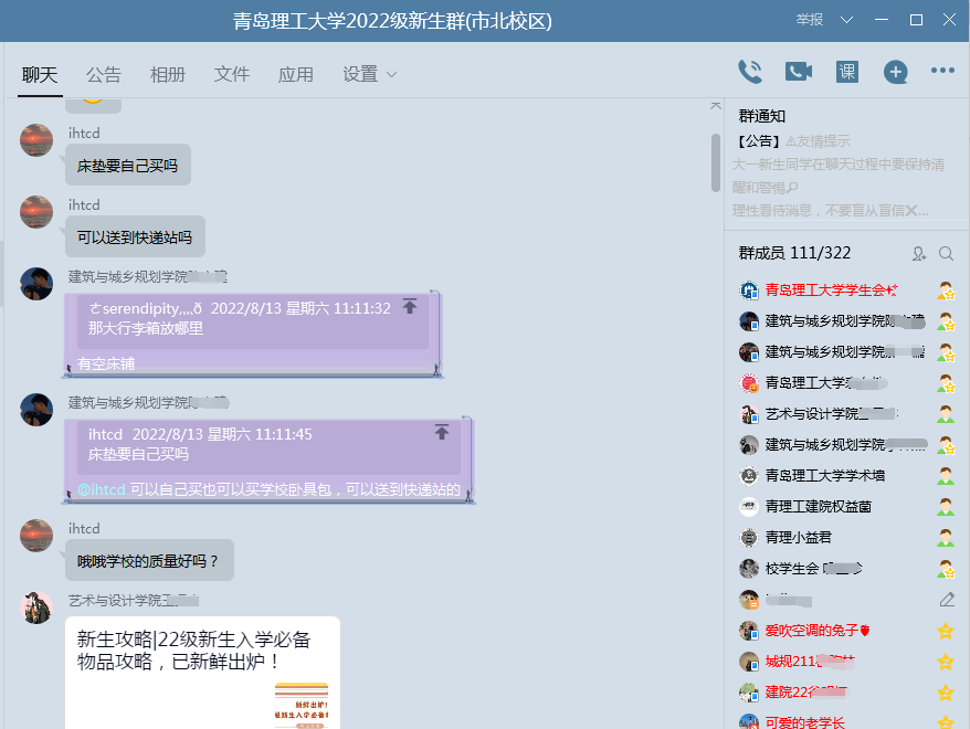 提前做好各类服务工作。团委、学生会建立2022级新生服务咨询QQ群,全天候不间断为新生提供信息辨伪和校园学习生活咨询等服务。学生工作处微信公众号推送新生关心话题6篇,回应新生关切。分配新生宿舍,协调完成对新生宿舍的粉刷、家具检修等工作。开通资助热线,为广大新生及家长答疑解惑、排忧解难。提前为新生准备爱心大礼包,切实保障家庭经济困难新生报到后不出校园即可满足基本学习生活需求。提前谋划制定新生中秋晚会工作方案、组建专项工作小组、筹备晚会节目,全力以赴做足准备。
