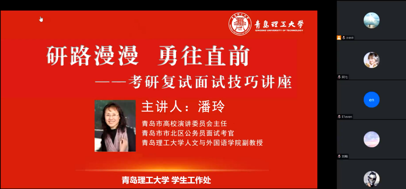 为帮助学生们更全面地了解复试流程,提升技巧,增强备战信心,学生工作处特邀面试专家人文与外国语学院潘玲副教授,于3月21日晚19:30通过线上讲授的方式,面向2023届考研复试学子,开展“研路漫漫,勇往直前”考研复试面试技巧专题讲座,近500名学生参加。