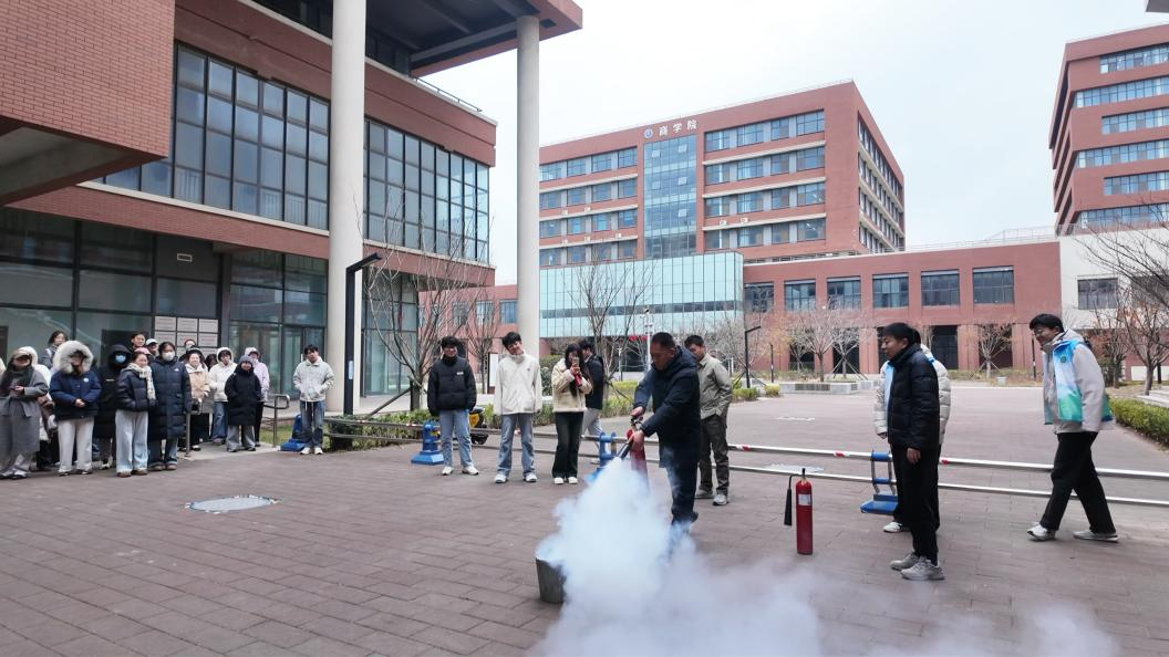 到达指定安全区域后,活动进入消防器材使用教学环节。消防科负责老师和郝田宇老师现场向同学们示范灭火器的正确操作方法,包括拔掉保险销、握住喷嘴、对准火源根部喷射等步骤。随后,学生代表依次进行实操体验,在烟雾点燃组配合下使用灭火器对模拟火源进行扑灭。同学们积极参与,现场氛围热烈,不少学生表示首次进行灭火器实战,更直观地理解了消防器材的重要性和使用技巧。