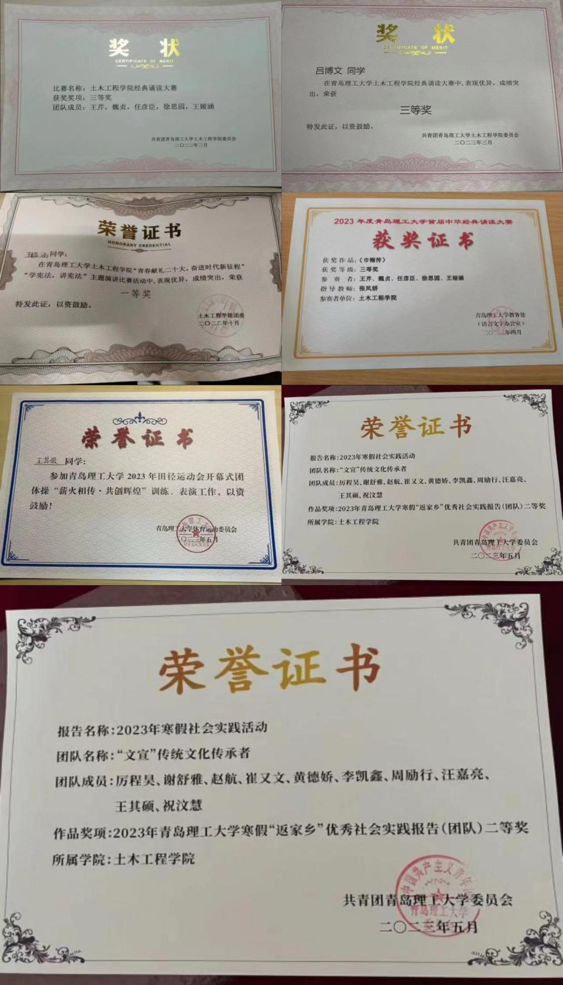 在学科竞赛方面,陈翔宇参加的山东省大学生先进成图技术与产品信息建模创新大赛获得了团队二等奖、个人三等奖,王其硕获得了个人二等奖及团队三等奖,周子洋、吕博文曹晨宇组队参加的“三创赛”荣获校级二等奖,王娅涵参加了互联网+大赛和挑战杯红色专项竞赛等等。