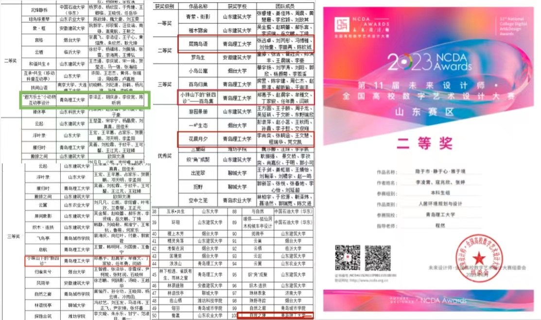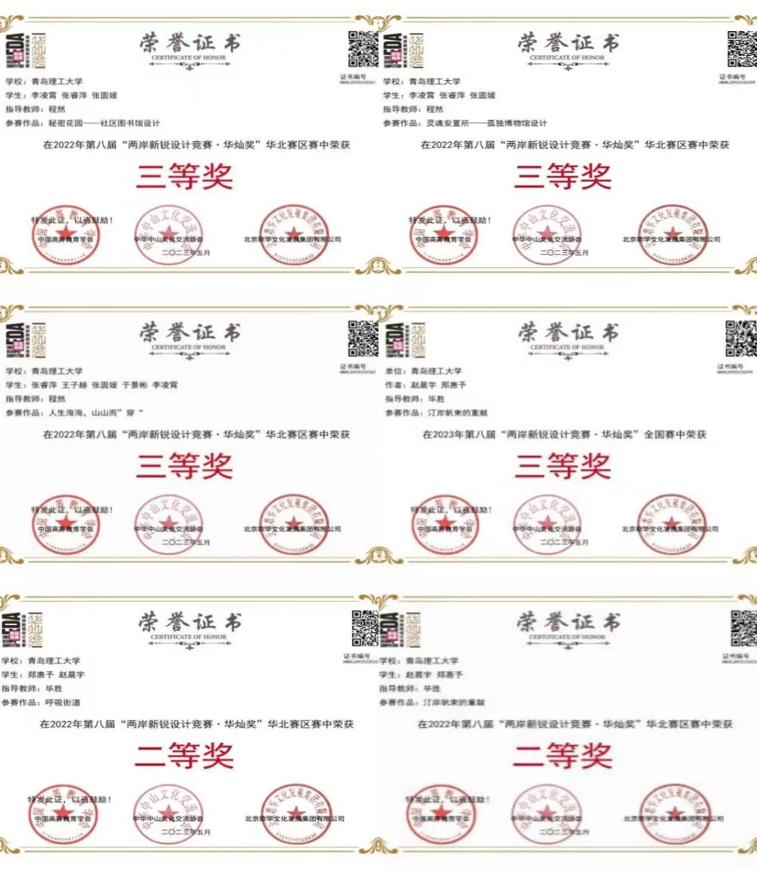 班级同学参与的国际级赛事包豪斯奖共获银奖2枚、铜奖2枚、优秀奖6枚;釜山国际建筑设计工作营取得了第四名的好成绩;在国家级的两岸新锐设计竞赛——华灿奖中取得了1个全国三等奖,2个省级二等奖、3个省级三等奖的好成绩。 “旅投杯”山东省建造设计大赛是2022-2023学年班级参与人数最多的赛事,获奖人数达到13人。班级同学在各赛道均取得不错的成果,其中一个团队是冲破重围,以100进30进7入围了最终决赛,并且成功搭建。