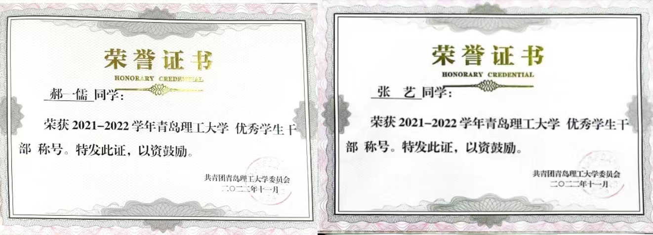 在2021-2022学年中有2名同学获得“优秀学生干部”荣誉称号,1名同学获得“优秀班干部”荣誉称号,2名同学获得“优秀团员”荣誉称号,有10名同学获得“优秀学生” 荣誉称号。