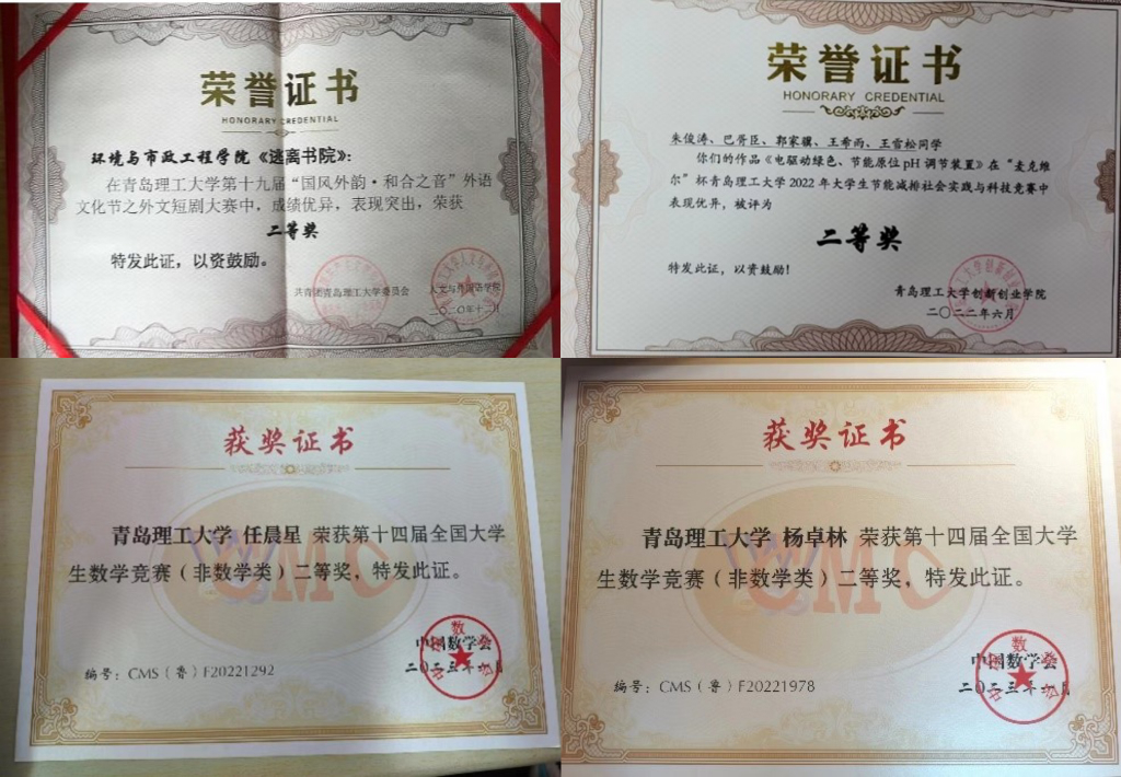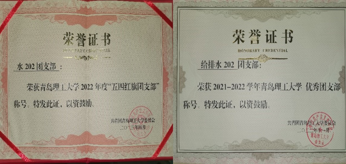 在团支部全体成员的共同努力下,荣获了校级2020-2021学年“优良学风标兵班”、校级2021-2022学年“优良学风标兵班”、“优秀团支部”荣誉称号。