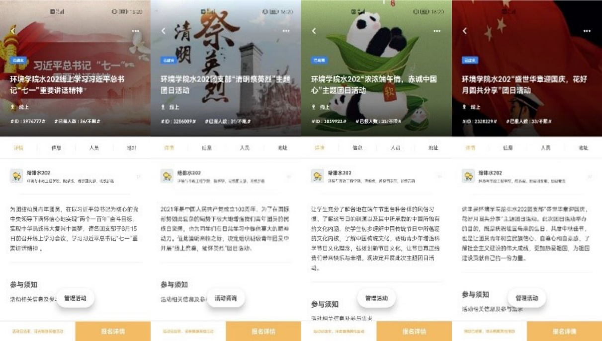 环境与市政工程学院学院水专业2020级2班团支部成立至今开展了“学党史,强信念,跟党走”主题团日活动、“七·一庆祝中国共产党成立100周年”党史学习教育、学习习近平总书记“七一”重要讲话精神主题学习会、“请党放心,强国有我”主题学习会、学习贯彻党的十九届六中全会精神主题班会等思想政治活动共计20余项,引领团员青年自觉增强“四个意识”、坚定“四个自信”、做到“两个维护”,强化团员意识,提高团员思想觉悟。