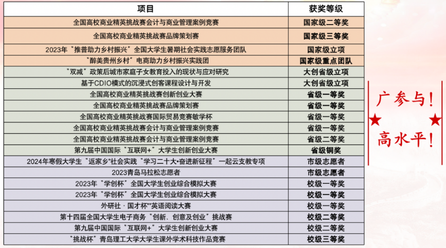 在优良的学风氛围下,财管222班同学全方位发展,在科创竞赛、社会实践和志愿服务等方面取得优异成绩,在多元发展中逐步成长为“六边形战士”。