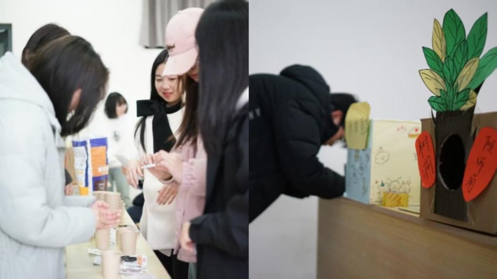 “春日萌芽”环节以自然生命力唤醒学生成长动力。参与学生在志愿者引导下,将承载着新学期目标的彩色心愿卡与绿植种子共同植入DIY花盆。“这种具象化的目标设定仪式,让我的学习规划变得触手可及。”社工241班马玺媛同学分享道。