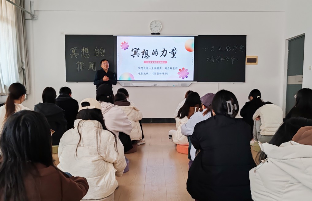 在“冥想之旅”环节,刘启辉为大家带来“冥想的力量”专题微讲座。他深入浅出地向大家阐释“什么是冥想”,尤其着重介绍了“正念冥想”对调节心理状态和提升自我觉察的显著效果。随后伴随着舒缓音乐,同学们逐步放松身体各部位,沉浸在深度冥想中,释放累积的压力。