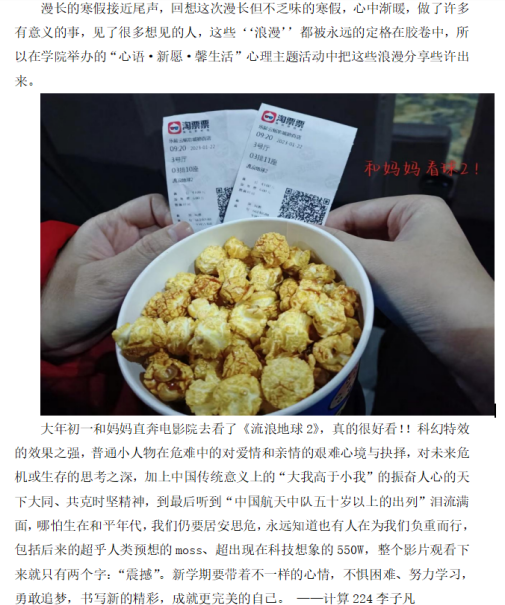 新愿崇高,放飞理想。一张彩色的卡纸,寄托着新学期美好的愿景。一句激励的话语,承载着你我他青春的梦想。计算224李子凡同学们以春节档电影《满江红》和《流浪地球2》为切入点分享岳飞抗金的故事和航天员邓清明的追梦故事,他表示:“新学期要带着不一样的心情,不惧困难、努力学习,勇敢追梦,书写新的精彩,成就更完美的自己。”