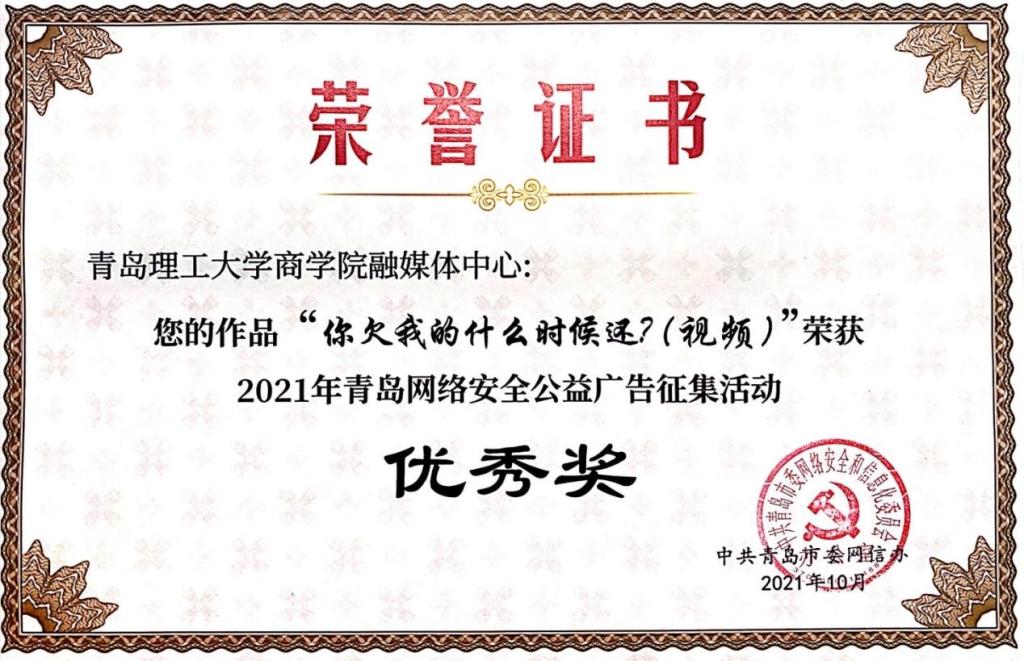 通过参加“红心向党”短视频大赛、青岛网络安全公益广告征集活动等,不仅在学院实现了在弘扬红色传统文化、加强网络安全教育全覆盖,同时充分锻炼了学生的创新思维与实践能力,对培养德智体美劳全面发展的商科人才具有重要意义。商学院将进一步结合新媒体平台优势,继续打造具有商科特色的融媒体品牌,推出具有时代热度和人文温度的高质量网络育人作品,共同构建和谐美好的校园文化育人环境。