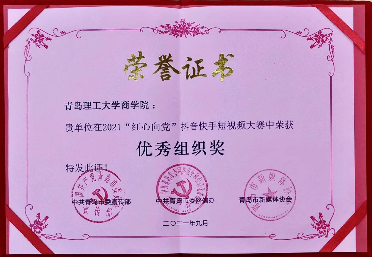 “红心向党”短视频大赛是近年来青岛市最高水准的短视频赛事,旨在追寻红色印记、传承红色基因,以强大的网络正能量凝聚全体市民的爱党爱国之情。商学院全体辅导员及学生各党支部紧密围绕建党百年,秉持创新实践融合党史学习的教育理念,通过讲述优秀党员故事、风俗习惯、校园风貌等角度展现青岛百年来的沧桑巨变,抒发学生家国情怀,讲述时代的变迁。经学院严格审选,共提交30件视频作品,在“红心向党”短视频大赛中荣获“优秀组织奖”。
