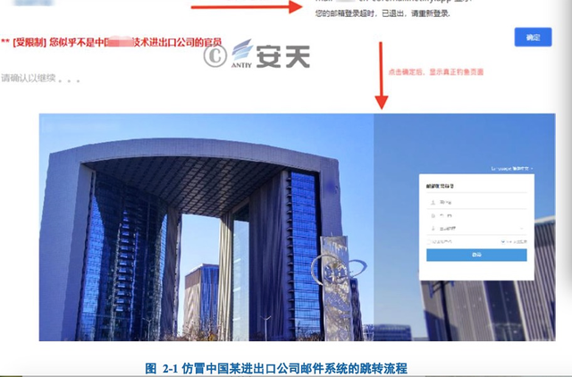 攻击者使用钓鱼网站进行攻击时,包括自动跳转型和直接展示型。其中自动跳转型是受害者通过钓鱼链接访问钓鱼网页时,钓鱼网页首先会展示“受限制”、“ 更新电子 邮件系统”等名义的静态网页。在等待攻击者设置的时间后,该钓鱼网页会弹出“您的邮箱登录超时,已退出,请重新登录”、“您账户所在的域已经过期”等弹窗。当受害者确认弹窗后,便会跳转至攻击者仿冒的邮箱登录页面。