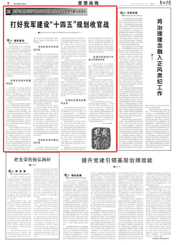 实现我军建设“十四五”规划圆满收官,对如期实现建军一百年奋斗目标,对以中国式现代化全面推进强国建设、民族复兴伟业,都具有重要意义。习主席在十四届全国人大三次会议解放军和武警部队代表团全体会议上强调,要处理好进度和质量、成本和效益、全局和重点、发展和监管、规划执行和能力形成的关系,走高质量、高效益、低成本、可持续发展路子,确保建设成果经得起历史和实战检验。这一重要论述是对我们党治国理政、强军兴军历史和实践经验的深刻总结,为打好我军建设“十四五”规划收官战提供了科学方法论指导,我们必须深入学习领会、抓好贯彻落实。