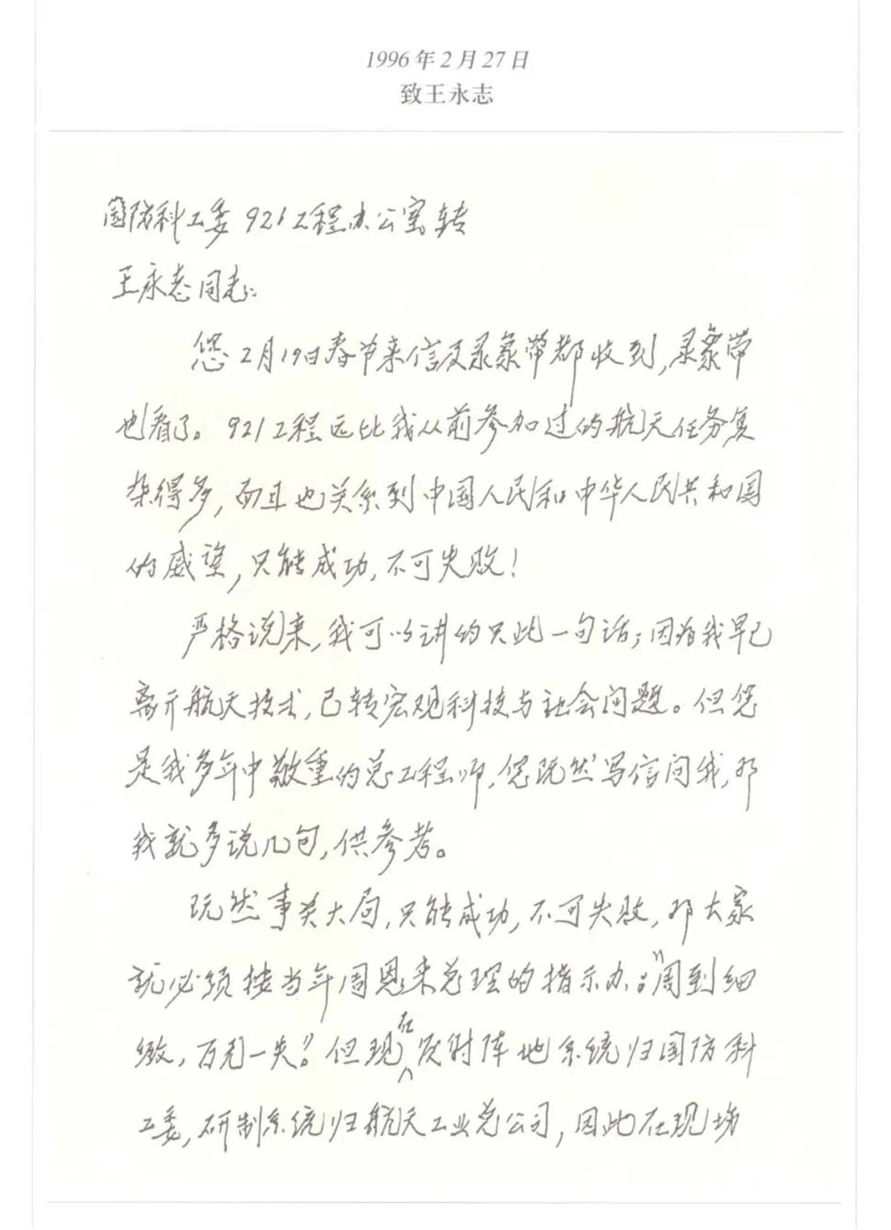 至2003年10月15日,“神舟五号”发射升空。2004年元宵节,王永志和中国首飞航天员杨利伟一道,前往钱学森家中看望钱老。钱学森一眼就认出了杨利伟,亲切勉励他:“你们现在干成功的事情比我干的要复杂,所以说,你们已经超过我了!祝贺你们。”从那以后,一种惯例形成:每次载人航天飞行任务成功后,航天员们都会上门探望钱老,聆听教诲。