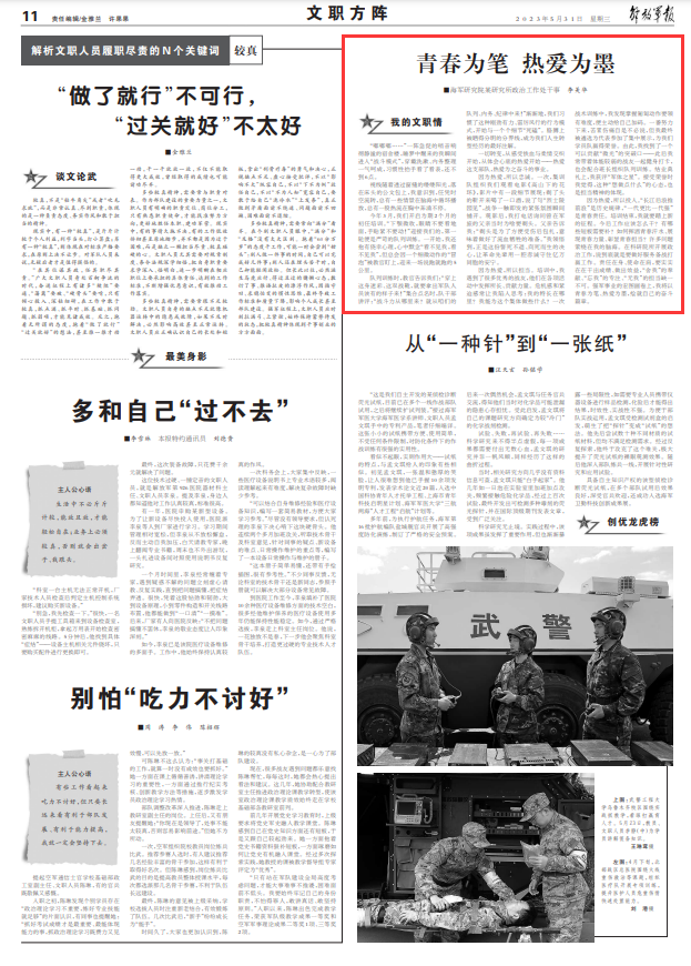 因为热爱,所以投入。“长江后浪推前浪”是历史规律,“一代更比一代强”是青春责任。培训结束,我就要踏上新的征程。今后工作应该怎么干?有哪些短板需要补?如何挥洒青春汗水、展现青春力量、彰显青春担当?许多问题萦绕在我的脑海。在科研院所开展政治工作,说到底就是要做好服务备战打赢工作。责任在身、使命在肩,要实实在在干出成绩、做出效益,“舍我”的奉献、“忘我”的专注、“无我”的担当缺一不可。强军事业的宏图画卷上,我将以青春为笔、热爱为墨,绘就自己的奋斗篇章。